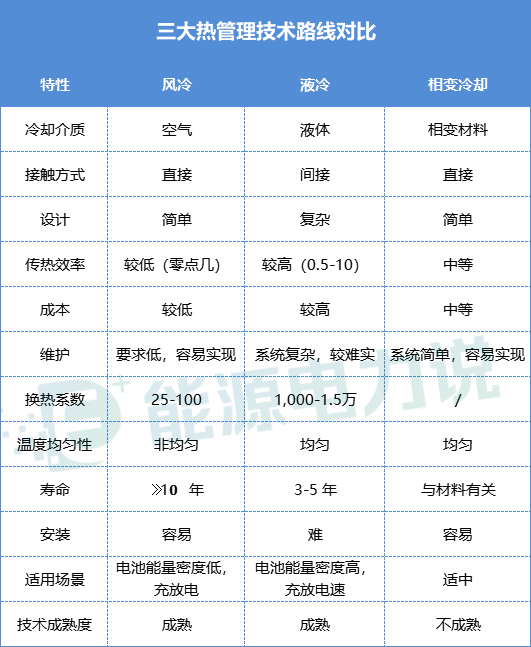 目前儲(chǔ)能熱管理的主流技術(shù)路線是風(fēng)冷和液冷。儲(chǔ)能熱管理技術(shù)路線主要分為風(fēng)冷、液冷、熱管冷卻、相變冷卻,其中熱管和相變冷卻技術(shù)尚未成熟。