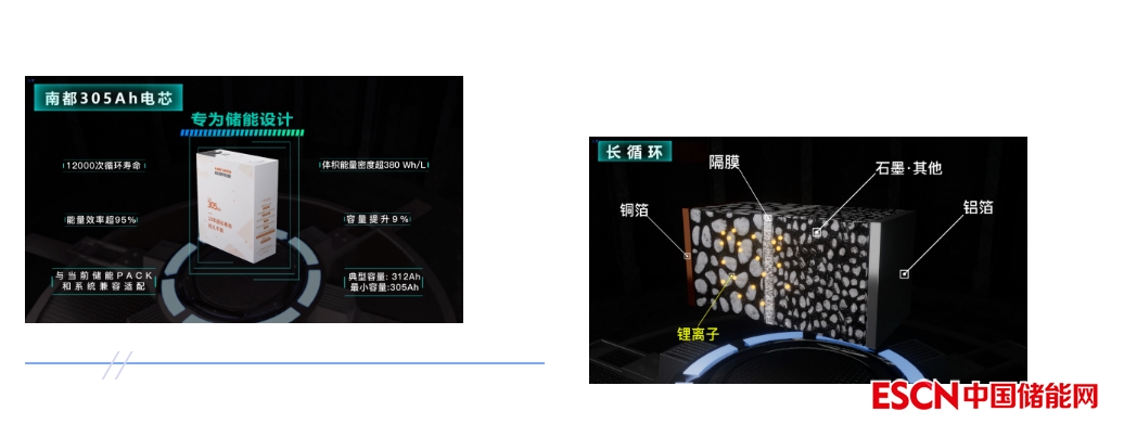 通過技術(shù)創(chuàng)新,南都305Ah儲(chǔ)能專用電池?fù)碛?0年超長壽命,體積能量密度超過380Wh/L,循環(huán)壽命可達(dá)12000次,能量效率超95%。