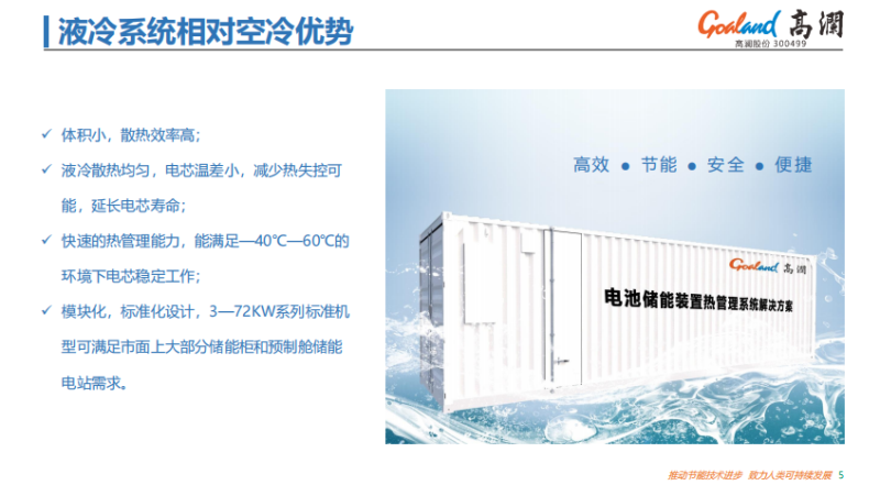 第三點是整個液冷系統(tǒng)的體積,隨著儲能能量的提升,特別是大規(guī)模的5MW以上,或者到了10MW以上來說,整個成本相對風冷系統(tǒng)會有很大的降低。目前來說,在分布式儲能系統(tǒng)上,如果做到了5MW以上,液冷系統(tǒng)的成本會比整個風冷系統(tǒng)有一定降低的。這是整個液冷相對于風冷的大概比較。