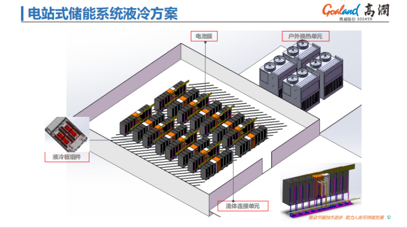 這是近期做的電站式儲能系統(tǒng)的總體液冷方案,可以看到在整個電站式儲能系統(tǒng)中,我們的分布大概跟剛才一樣,作為吸熱器件,在電池簇中,能夠吸熱的所有部件,就是液冷板的組件,到后面整個流體連接單元,以及戶外的換熱單元,這樣一個大致的系統(tǒng)構成。