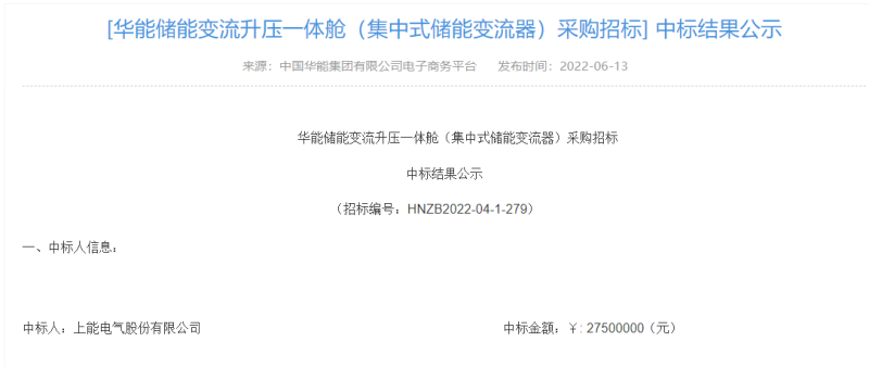 中國儲能網(wǎng)訊:據(jù)了解,6月13日,中國華能集團有限公司電子商務平臺發(fā)布華能儲能變流升壓一體艙(集中式儲能變流器)采購中標結果公示。公告中顯示,中標人為上能電氣股份有限公司,中標金額為2750萬元。