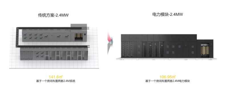 以8MW的數(shù)據(jù)中心為例,傳統(tǒng)的建設(shè)模塊采用600kVA*4并機(jī)方案,整體約為190個(gè)柜體,占地面積為708㎡,而電力模塊方案僅需110柜,占地面積為472㎡。對(duì)于寸土寸金的IDC業(yè)務(wù)來說,可以提升約10%的機(jī)柜數(shù)量。