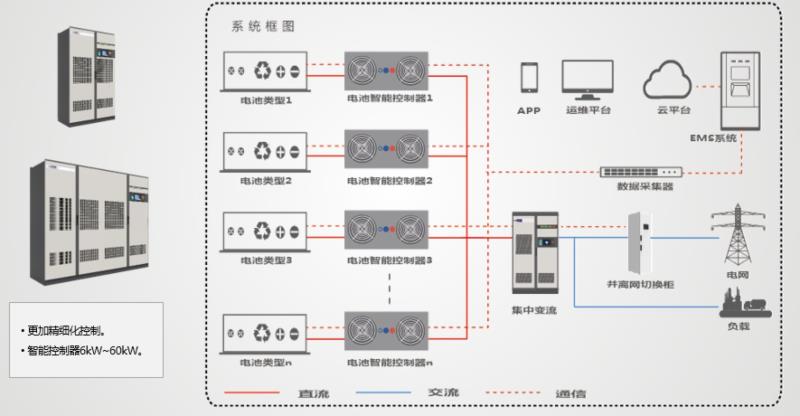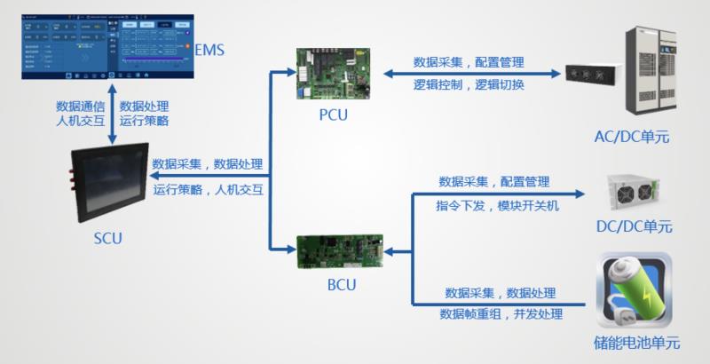 “集”主要指集成化,將PCS系統(tǒng)集成了BCU、PCU、SCU和EMS單元,BCU對(duì)電池和DC/DC數(shù)據(jù)采集和和數(shù)據(jù)處理;PCU采集AC/DC單元數(shù)據(jù)進(jìn)行上傳給SCU,并根據(jù)SCU指令進(jìn)行邏輯控制。SCU與BCU、PCU、電表等設(shè)備進(jìn)行通訊,實(shí)現(xiàn)數(shù)據(jù)處理,進(jìn)行策略控制及人機(jī)交互;同時(shí),內(nèi)部還集成EMS系統(tǒng)。