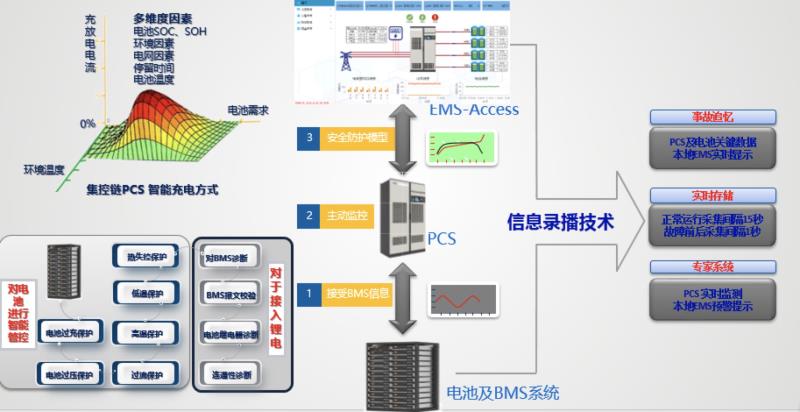 “控”主要指智能管控,在集控鏈PCS內(nèi)部集成的EMS被稱為Access,即設(shè)備級(jí)EMS,是基于BMS對(duì)對(duì)電池充放電管控下,增加的智能管控功能,且該功能貫穿于整個(gè)充放電過(guò)程。當(dāng)BMS防護(hù)失效時(shí),仍能保證充放電的安全可靠,如電池過(guò)壓,過(guò)充,BMS故障、上傳數(shù)據(jù)不更新或者錯(cuò)誤時(shí),智能管控檢測(cè)電池和BMS狀態(tài)異常,并主動(dòng)終止充放電。而且具有信息錄播功能,如同儲(chǔ)能系統(tǒng)的黑匣子,能夠主動(dòng)記錄故障發(fā)生前后的關(guān)鍵數(shù)據(jù),用于問(wèn)題定位、分析和解決。