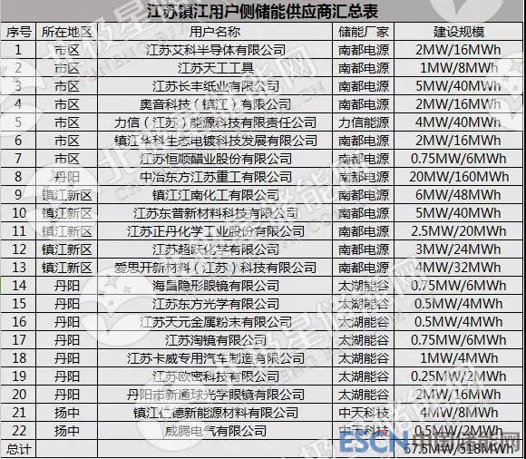 事實(shí)上,除了上述兩大市場(chǎng)外,江蘇省用戶側(cè)儲(chǔ)能市場(chǎng)這一特征更加明顯,據(jù)國(guó)網(wǎng)江蘇電科院高級(jí)工程師史明明介紹,江蘇省內(nèi)用戶側(cè)儲(chǔ)能主要供應(yīng)商為南都電源、太湖能谷、中天科技、力信能源,庫(kù)博能源。據(jù)統(tǒng)計(jì),這5家企業(yè)儲(chǔ)能規(guī)模占全省用戶側(cè)儲(chǔ)能裝機(jī)容量的90%以上。下圖為江蘇鎮(zhèn)江用戶側(cè)儲(chǔ)能項(xiàng)目表。