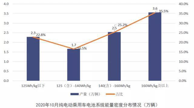 2020年10月,我國純電動乘用車系統(tǒng)能量密度在125Wh/kg以下和160Wh/kg以上車型產(chǎn)量分別為2.3萬輛和3.6萬輛,占比分別為22.8%和35.5%,125Wh/kg(含)-140Wh/kg以下車型產(chǎn)量占比達(dá)16.5%,較9月份上升7.9個(gè)百分點(diǎn)。