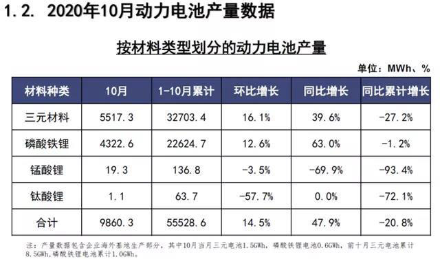 10月,我國動力電池產(chǎn)量共計(jì)9.86GWh,同比增長47.9%,環(huán)比增長14.5%。其中三元電池產(chǎn)量5.5GWh,占總產(chǎn)量56%,同比增長39.6%,環(huán)比增長16.1%;磷酸鐵鋰電池產(chǎn)量4.3GWh,占總產(chǎn)量43.8%,同比增長63%,環(huán)比增長12.6%。
