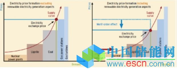 可再生能源參與市場(chǎng)競(jìng)價(jià)后,大幅拉低市場(chǎng)批發(fā)電價(jià)。當(dāng)電力市場(chǎng)中沒有可再生能源時(shí),首先競(jìng)價(jià)成功的是核電、其次是煤電、氣電。如圖1左側(cè)所示,核電、煤電和氣電之和能夠滿足用電需求,小紅點(diǎn)就是供需曲線交叉點(diǎn),這個(gè)點(diǎn)就是此時(shí)市場(chǎng)結(jié)算價(jià)格。當(dāng)可再生能源進(jìn)入電力市場(chǎng)之后(如圖1右側(cè)所示),由于可再生能源發(fā)電邊際成本最低(接近零),首先競(jìng)價(jià)成功,然后再安排核電、煤電就能夠滿足電力需求,這樣就不再需要邊際成本更高的電源(氣電),此時(shí)電力市場(chǎng)供應(yīng)曲線右移、結(jié)算價(jià)格下移,導(dǎo)致結(jié)算價(jià)格下跌。