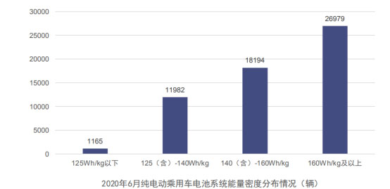 2020年6月,我國純電動乘用車系統(tǒng)能量密度在160Wh/kg及以上車型產量占比明顯提升,達46.3%,較5月份提升15.0%;125(含)-140Wh/kg和140(含)-160Wh/kg車型產量占比分別為20.5%和31.2%;125Wh/kg以下車型占比2.0%,較5月稍有增長。