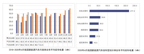 2020年6月,我國新能源汽車按車型劃分的平均裝車電量51.5kWh,環(huán)比上升