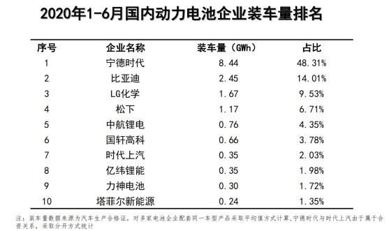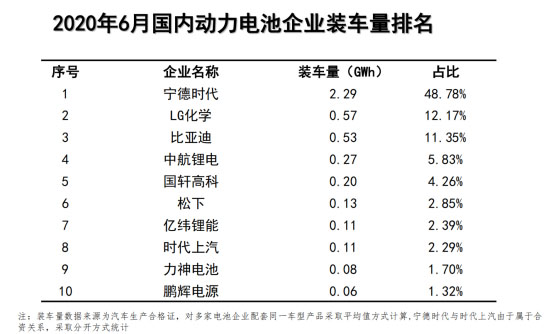 2020年6月,我國新能源汽車市場共計48家動力電池企業(yè)實現(xiàn)裝車配套,較5月份增加6 家,其中排名前10的動力電池企業(yè)分別是寧德時代、LG化學、比亞迪、中航鋰電、國軒高科、松下、億緯鋰能、時代上汽、力神電池、鵬輝電源。