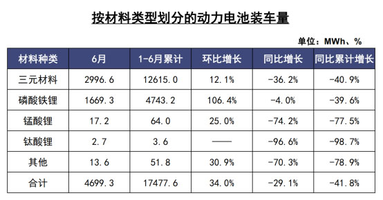 2020年6月,我國動力電池裝車量為4.7GWh,同比下降29.1%,環(huán)比增長34.0%。其中,三元電池共計裝車3.0GWh,同比下降36.2%,環(huán)比上升12.1%;磷酸鐵鋰電池共計裝車1.7GWh,同比下降4.0%,環(huán)比增長106.4%。