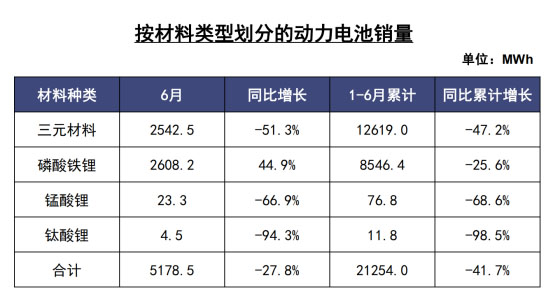 2020年6月,我國動力電池銷量共計為5.2GWh,同比下降27.8%。其中,三元電池銷售為2.5GWh,同比下降51.3%,占總銷量59.4%;磷酸鐵鋰電池銷售為2.6GWh,同比增長44.9%,占總銷量40.2%。