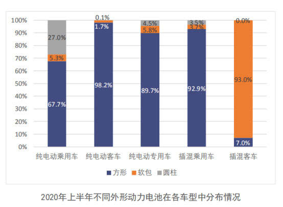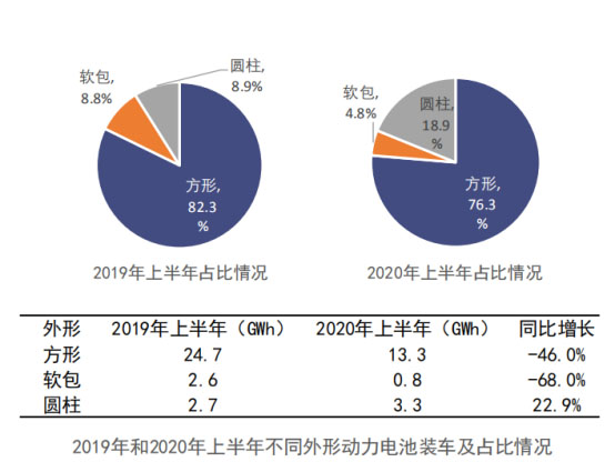 從電池類型來看,2020年上半年,國內新能源汽車市場仍以方形動力電池為主,共計裝車13.3GWh,占比76.3%,較2019年上半年下降了6%。此外,受特斯拉model3車型產量帶動,圓柱電池裝車占比較去年同期提升了10%;另外,軟包電池實現(xiàn)裝機量約0.26 GWh,環(huán)比增長24%,占總體的5%,整體勢力較弱。