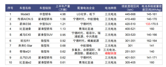 根據(jù)中國汽車工業(yè)協(xié)會發(fā)布數(shù)據(jù),2020年上半年,我國產量排名前十的純電動乘用車有特斯拉、蔚來、比亞迪、威馬、奇瑞、北汽等企業(yè)車型,所用動力電池主要以三元電池為主,除蔚來ES6外,電池系統(tǒng)能量密度在140Wh/kg以上。