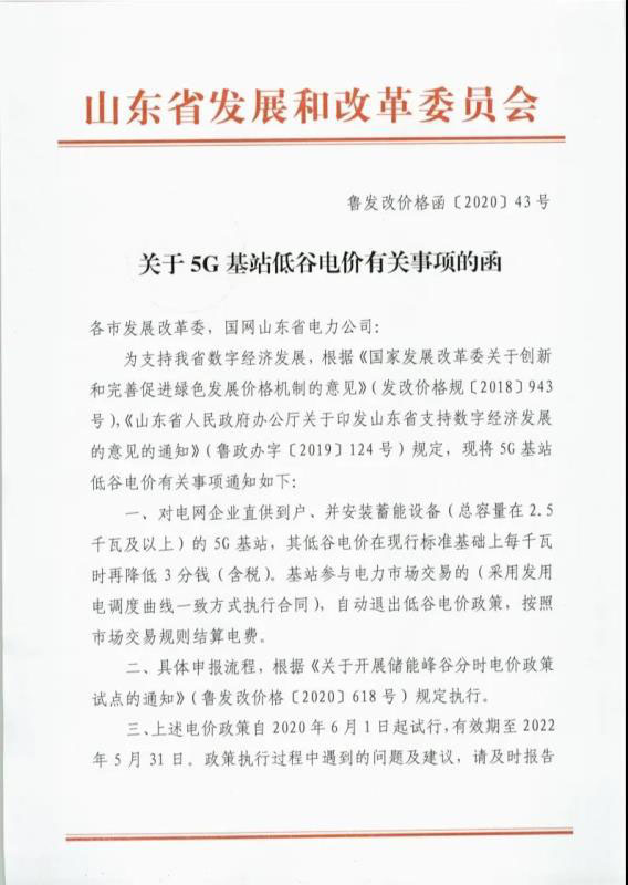 山東省發(fā)改委近日印發(fā)《關(guān)于5G基站低谷電價(jià)有關(guān)事項(xiàng)的函》,文件指出對電網(wǎng)企業(yè)直供到戶、安裝2.5千瓦及以上儲(chǔ)能設(shè)備的5G基站,在執(zhí)行峰谷電價(jià)時(shí)其低谷電價(jià)在現(xiàn)行標(biāo)準(zhǔn)基礎(chǔ)上每千瓦時(shí)再降低3分錢(含稅)。具體根據(jù)山東《關(guān)于開展儲(chǔ)能峰谷分時(shí)電價(jià)政策試點(diǎn)的通知》執(zhí)行,文件自2020年6月1日起執(zhí)行,有效期至2022年5月31日。