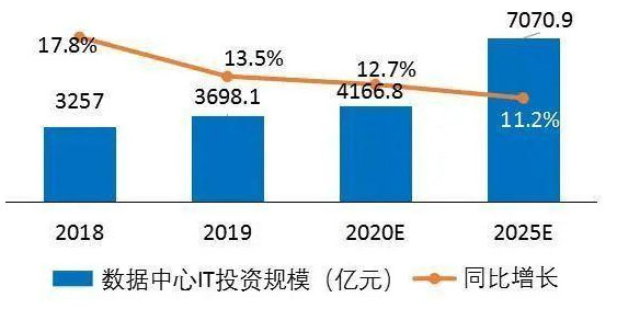 孫會峰指出,2019年中國數(shù)據(jù)中心IT投資規(guī)模達3698.1億,預(yù)計2020年這一規(guī)模將增長12.7%,達到4166.8億元;而到2025年,預(yù)計這一投資規(guī)模將達到7070.9億元。