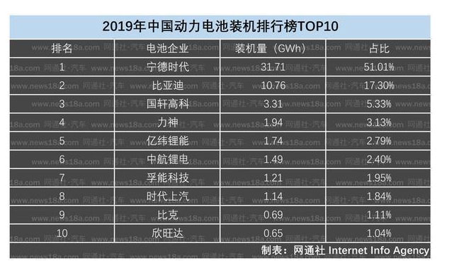 比亞迪、國軒高科動力電池裝機量占比較2018年有所下降。天津力神、億緯鋰能、中航鋰電、孚能科技、時代上汽、比克電池、欣旺達依次排在第4-10位。欣旺達、時代上汽首次躋身前十位。但是北京國能與卡耐新能源,在2019年跌出了前十名。
