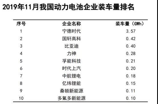 值得注意的是,2019年10月份動(dòng)力電池裝車量排名第二的比亞迪,11月以0.40GWh裝車量跌落到第三,被國軒高科以0.42GWh超越。不過,比亞迪只是11月單月裝車量被超。