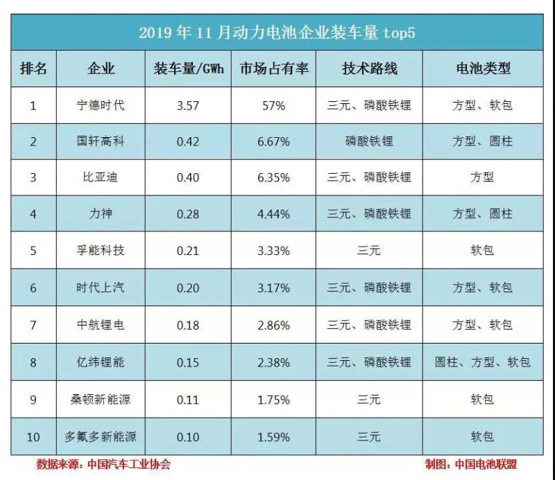 2019年11月,我國動(dòng)力電池企業(yè)裝車量排名前十的分別為寧德時(shí)代、國軒高科、比亞迪、力神、孚能科技、時(shí)代上汽、中航鋰電、億緯鋰能、桑頓新能源、多氟多新能源,合計(jì)市場份額占比89.5%。
