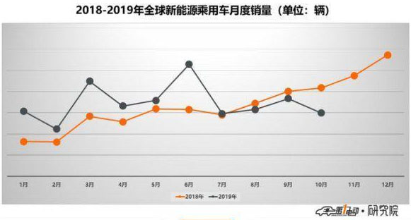 市場滲透率來看,2019年10月,全球新能源乘用車市場份額為1.9%,全球平均占比2.2%。最后的兩個月能否將滲透率提高至6月的2.4%,還有待觀望。