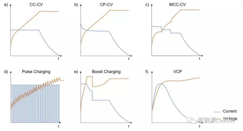 恒流恒壓充電(CCCV)是最傳統(tǒng)的一種充電方式,該方式首先采用較大電流進(jìn)行恒流充電,在達(dá)到截止電壓后,轉(zhuǎn)為恒壓充電,不斷降低充電電流,從而盡可能的減少電池的極化。因此對(duì)于這種傳統(tǒng)的充電方式而言,縮短充電時(shí)間最有效的方法就是提高充電電流,但是提升充電電流一方面會(huì)導(dǎo)致極化增加,增加恒壓充電的時(shí)間,另一方面大電流充電也會(huì)導(dǎo)致負(fù)極析鋰,因此對(duì)于快充而言選擇合適的充電策略也是非常重要的內(nèi)容。