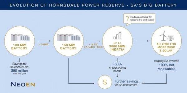 據(jù)悉,南澳大利亞電網(wǎng)需要6000MWs的慣性,Neoen表示,升級后的霍恩斯代爾儲能站可以滿足一半的慣性。