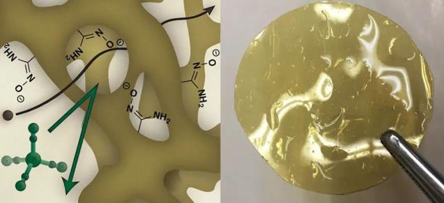 下圖(左):AquaPIM 由特種的聚合物制成,它能在高pH值的情況下變得離子化,生成可高度導(dǎo)電并具有高度選擇性的孔。下圖(右)這種材料可以被塑造成各種形狀,例如一種獨立式的膜。