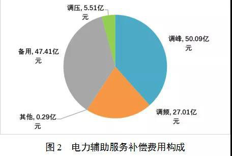 從電力輔助服務補償費用的結構上看,調(diào)峰補償費用總額50.09億元,占總補償費用的38.44%;調(diào)頻(西北區(qū)域調(diào)頻為AGC(自動發(fā)電控制)加一次調(diào)頻,其他區(qū)域調(diào)頻為AGC)補償費用總額27.01億元,占總補償費用的20.73%;備用補償費用總額47.41億元,占比36.38%;調(diào)壓補償費用5.51億元,占比4.23%;其他補償費用0.29億元,占比0.22%(見圖2)。