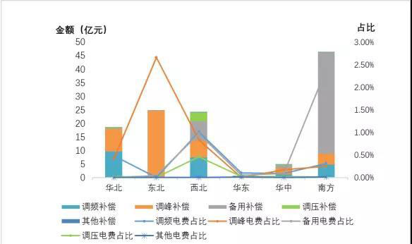 從分項電力輔助服務補償費用來看,調(diào)峰、調(diào)頻和備用補償費用占總補償費用的90%以上。其中,東北區(qū)域調(diào)峰補償力度最大,西北區(qū)域調(diào)頻補償力度最大,南方區(qū)域備用補償力度最大??傮w來看,南方區(qū)域整體電力輔助服務補償力度最大(見圖3)。