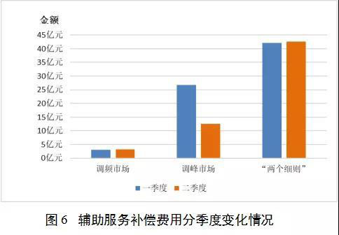 2019年上半年,通過輔助服務市場產(chǎn)生的補償費用共45.63億元,其中通過調(diào)峰輔助服務市場產(chǎn)生的補償費用共39.28億元,市場月均補償費用6350萬元;通過調(diào)頻輔助服務市場產(chǎn)生的補償費用共6.36億元,市場月均補償費用2648萬元。2019年一、二季度電力輔助服務補償費用如圖6所示,受供暖影響一季度調(diào)峰市場費用明顯高于二季度。