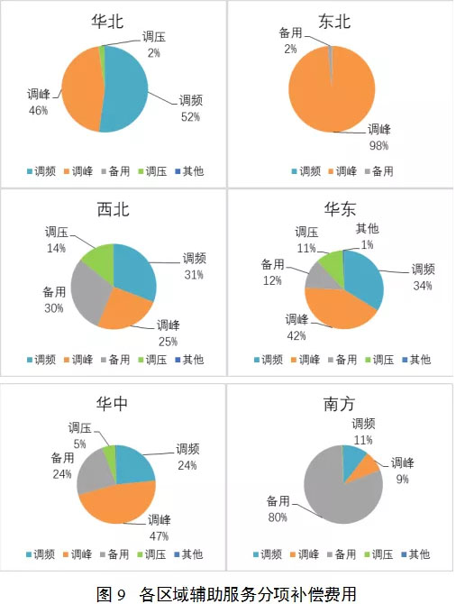 各區(qū)域電力輔助服務分項補償費用如圖9所示,各項費用比例構成各有特點。