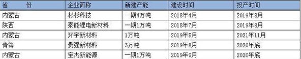 2019年國內(nèi)三季度投產(chǎn)的負(fù)極材料項(xiàng)目共有兩個(gè),分別是內(nèi)蒙古杉杉包頭一體化生產(chǎn)項(xiàng)目的一期4萬噸/年和秦能鋰電的負(fù)極材料生產(chǎn)項(xiàng)目一期1萬噸/年,而其他已規(guī)劃的項(xiàng)目陸續(xù)開工建設(shè),分別是環(huán)宇新材料1萬噸/年、貴強(qiáng)新材料3萬噸/年、寶杰新能源的一期1萬噸/年的負(fù)極材料項(xiàng)目。詳情如下表。