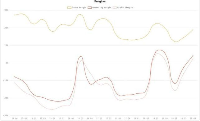特斯拉2014年Q4至2019年Q3綜合毛利率、營(yíng)業(yè)利潤(rùn)率 來(lái)源:hypercharts