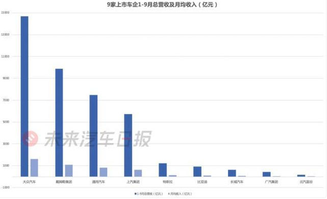 10億元對(duì)于一般的創(chuàng)業(yè)公司而言可能是個(gè)遙不可及的天文數(shù)字,但對(duì)于傳統(tǒng)的頭部汽車(chē)制造商來(lái)說(shuō)只是個(gè)小數(shù)目。未來(lái)汽車(chē)日?qǐng)?bào)(ID:auto-time)查詢(xún)9家國(guó)內(nèi)外上市車(chē)企2019年第三季度財(cái)報(bào)發(fā)現(xiàn),其前三季度營(yíng)收均超百億元,月均收入超10億元。