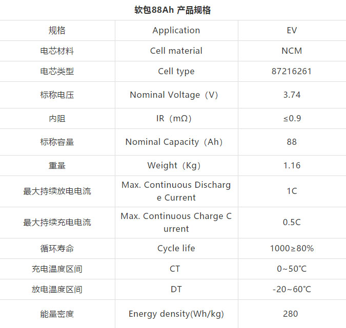 A:88Ah軟包電池是我司最新開發(fā)的高能量密度電池產品,單體能量密度達到280Wh/kg,循環(huán)壽命1000次以上。該產品定位于乘用車市場,組裝成電池包后,最高續(xù)航里程可達 720km以上。該電池具有優(yōu)異的安全性能,可通過1C6.3V過充,熱沖擊150度30min、短路、電池荷電95% SOC時可通過針刺等國標安全測試。