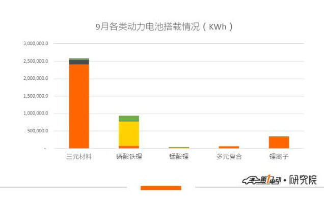 9月三元材料的搭載量為2.57GWh,其中乘用車占94%,三元材料搭載量占總搭載量的64.9%,與8月相比有所下降。磷酸鐵鋰電池隨著客車產(chǎn)量略微回升,裝機量提升至0.95GWh,在月度裝機中的占比也上漲至24%。錳酸鋰與多元復合電池9月合計裝機98.9MWh,占比2.5%。