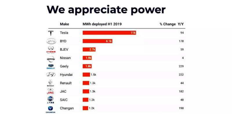 據(jù)AdamasIntelligence發(fā)布的最新電動(dòng)車市場(chǎng)調(diào)查報(bào)告顯示,2019年上半年產(chǎn)的新能源乘用車中裝載的電池總?cè)萘繛?6.3 GWh,特斯拉以11 GWh的裝機(jī)量排名第一。