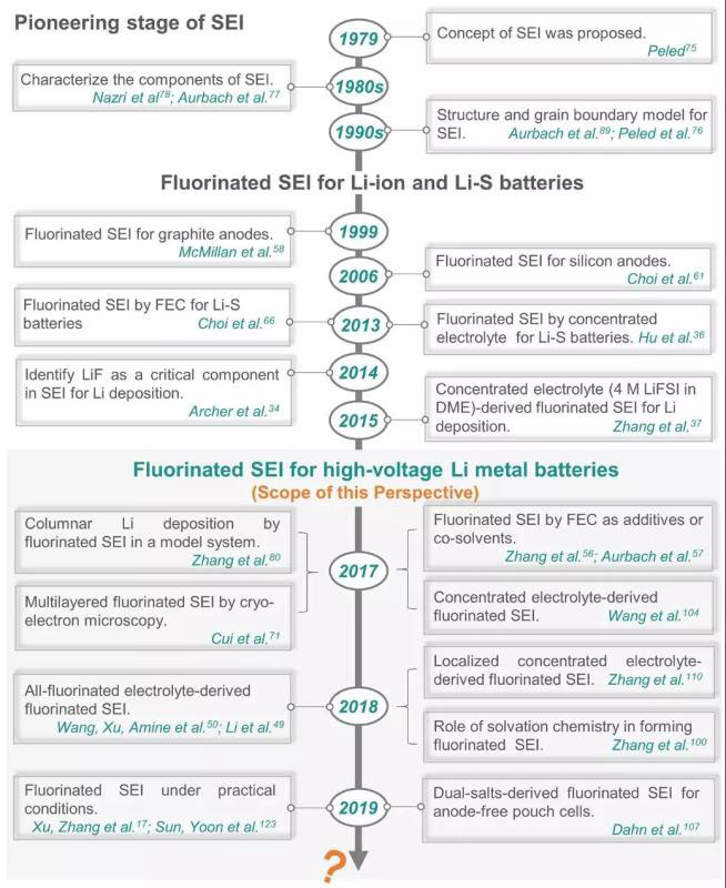 圖2.氟化SEI在鋰離子電池和高壓鋰金屬電池中的發(fā)展史。