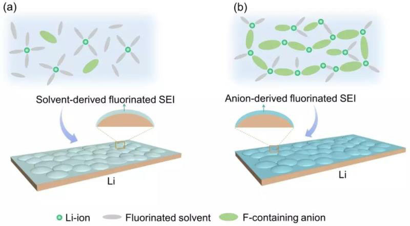 圖3. 兩種氟化 SEI:(a) 溶劑分解所得氟化 SEI,(b) 陰離子分解所得氟化 SEI。