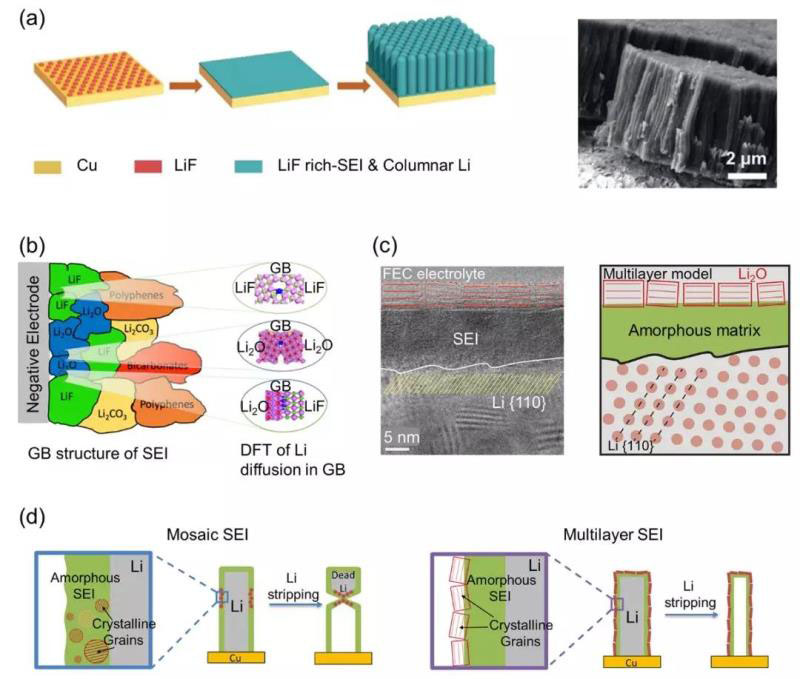 氟化SEI的組成及結(jié)構(gòu)在很大程度上決定了氟化SEI的離子擴(kuò)散、界面能、空間阻抗以及機(jī)械性能等理化性質(zhì)。組成上,LiF被認(rèn)為是氟化SEI中起關(guān)鍵作用的主要成分。Archer等研究表明,鹵素陰離子,尤其是氟離子,可大大增加SEI的表面擴(kuò)散系數(shù)。Zhang等通過(guò)模型體系表明,SEI中的LiF可以誘導(dǎo)鋰的均勻形核與生長(zhǎng),使鋰呈規(guī)則的柱狀生長(zhǎng)(圖4 a)。Mashayek等通過(guò)理論計(jì)算表明,氟化SEI中鋰離子在LiF/Li2O異質(zhì)晶界間的擴(kuò)散要快于LiF/LiF 及 Li2O/Li2O等均質(zhì)晶界(圖4 b)。結(jié)構(gòu)上,Cui等通過(guò)冷凍電鏡觀察到氟化SEI為多層結(jié)構(gòu)(圖4 c)。相比于馬賽克結(jié)構(gòu)的SEI,層狀結(jié)構(gòu)的氟化SEI中鋰的脫出更加均勻,從而減少死鋰的生成(圖4 d)。