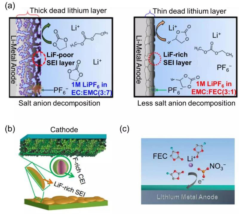 2)從氟化SEI的基礎(chǔ)理解,溶劑分解所得氟化SEI和陰離子分解所得氟化SEI三個(gè)方面總結(jié)分析了氟化SEI的組成、結(jié)構(gòu)、特性,設(shè)計(jì)策略及實(shí)際應(yīng)用