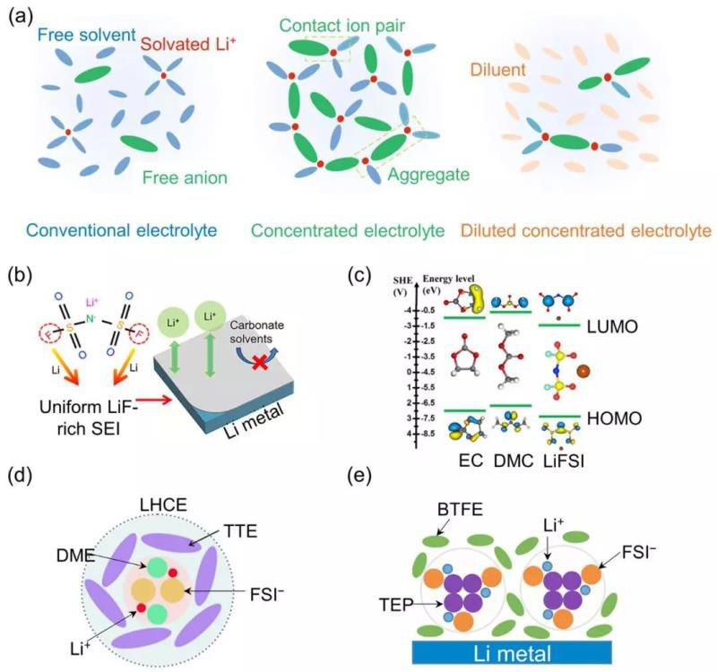 為了克服HCE 粘度大、成本高的缺點(diǎn),Zhang等提出了一種局部高濃度電解液(LHCE), 通過(guò)加入一種惰性溶劑來(lái)稀釋 HCE。Zhang 等報(bào)導(dǎo)了一種以雙三氟乙基醚(BTFE)為稀釋劑的 LHCE(1.2 M LiFSI/DMC-BTFE, 摩爾比為 1:2)【8】。該 LHCE 中形成的氟化 SEI 可促使鋰以緊密塊狀形式沉積,從而在高壓金屬鋰電池中獲得高的庫(kù)倫效率及穩(wěn)定的循環(huán)性能。為了利用醚類(lèi)溶劑與金屬鋰的良好兼容性,Zhang,Xu 等報(bào)導(dǎo)了一種能在高壓金屬鋰電池中應(yīng)用的醚類(lèi) LHCE(LiFSI-1.2DME-3TTE,摩爾比,其中 TTE(1,1,2,2-四氟乙基-2,2,3,3-四氟丙基醚)為稀釋劑)(圖6 d)。