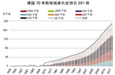 2018年,35千伏及以上輸電線路長度189.20萬千米,較1949年增長291倍,最高電壓等級1100千伏,位列世界第1位。