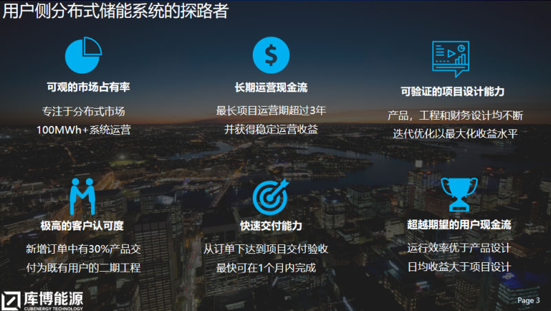 今天我會(huì)花少量的時(shí)間和大家簡(jiǎn)單介紹一下庫(kù)博能源是一家怎樣的公司,之前我們市場(chǎng)宣傳工作做得很少,但是一直在練內(nèi)功。公司2014年成立,15年初開(kāi)始正式運(yùn)營(yíng),2016年決定開(kāi)始切入到儲(chǔ)能系統(tǒng)產(chǎn)品后,就幾乎全部投入進(jìn)來(lái),剛開(kāi)始摸索時(shí)候可謂是困難重重,行業(yè)前景不錯(cuò),可是沒(méi)有客戶愿意嘗試買(mǎi)單,當(dāng)時(shí)我們使用自有資金來(lái)投最初的幾套系統(tǒng),大概花了1年多的時(shí)間,我們的產(chǎn)品的收益能力慢慢得到了行業(yè)認(rèn)可,在此也感謝這幾年的合作伙伴。雖然目前我們更多關(guān)注的是用戶側(cè)場(chǎng)景,但是我們相信分布式儲(chǔ)能系統(tǒng)最大的應(yīng)用場(chǎng)景應(yīng)該是為新能源提供緩沖和更穩(wěn)定的輸出,解決全球范圍內(nèi)的局部電力系統(tǒng)因?yàn)槿狈A(chǔ)設(shè)施建設(shè)導(dǎo)致的薄弱問(wèn)題。因此我們自己有一個(gè)口號(hào)叫Renewable Energy Never Stops.