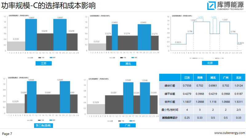 首先在kW方面,在用戶側(cè)主要有3大類倍率選擇,分別是0.5C,0.33C和0.25C。從我們的角度來(lái)看,為了和目標(biāo)財(cái)務(wù)成本賽跑,每天2充2放是基本條件。在這樣的環(huán)境下,江蘇和北京是我們青睞的市場(chǎng),要么倍率小,要么價(jià)差高。珠三角的東莞,佛山,江門(mén),中山,珠海次之,湖北某些區(qū)域再次之,廣州反而是我們最頭疼的區(qū)域,上圖可以看出廣州地區(qū)充電區(qū)間僅為2個(gè)小時(shí),不僅因?yàn)镻CS和變壓器的增加拉高了系統(tǒng)成本,而且還會(huì)在平期出現(xiàn)了另外一個(gè)問(wèn)題,對(duì)于最大需量的影響。