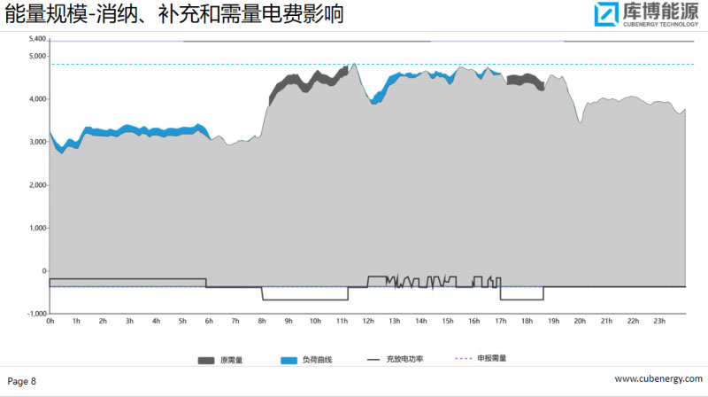 上圖是我們?cè)诮K的投運(yùn)的一個(gè)項(xiàng)目應(yīng)用負(fù)荷數(shù)據(jù),從圖可以看出:在谷期時(shí)間段,充電并無(wú)問(wèn)題,甚至可以放到更大,但是真正的問(wèn)題來(lái)自于平期時(shí)間段,一旦滿額定功率充電,就會(huì)導(dǎo)致最大需量超過(guò)設(shè)定的最大需量值,有可能成為當(dāng)月內(nèi)的最大需量,這樣的負(fù)荷特性需要我們沿著需量線來(lái)做動(dòng)態(tài)充放電策略,對(duì)應(yīng)的結(jié)果就是在晚上的17點(diǎn)到21點(diǎn)之間無(wú)法按照預(yù)期正常放電。所以基于這三個(gè)制約因素,系統(tǒng)的能量將被限制在合理的投入范圍內(nèi)。那么一旦用戶確認(rèn),那么隨之而來(lái)的功率規(guī)模和能量規(guī)模都會(huì)相繼確認(rèn)。