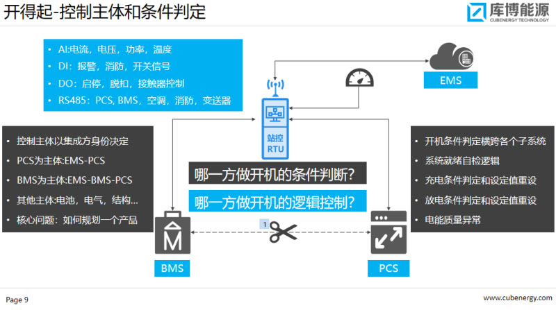 從庫(kù)博的角度,我們賦予了這三條一些獨(dú)特的內(nèi)涵。首先是系統(tǒng)開(kāi)的起來(lái),這里面包含兩層含義,第一個(gè)是誰(shuí)來(lái)開(kāi)機(jī),第二個(gè)是開(kāi)機(jī)具備什么條件。首先是誰(shuí)來(lái)開(kāi)機(jī)的問(wèn)題,在目前的行業(yè)里面,不同的系統(tǒng)集成方,對(duì)待這個(gè)問(wèn)題的時(shí)候總會(huì)把主導(dǎo)權(quán)放到自己手上,當(dāng)然我們也不例外,當(dāng)PCS供應(yīng)鏈作為系統(tǒng)集成方時(shí),控制鏈路是EMS-PCS-EMS,而當(dāng)BMS是系統(tǒng)集成方時(shí),控制鏈路是EMS-BMS-PCS,當(dāng)然無(wú)論怎么樣,怎么控制這個(gè)問(wèn)題本身沒(méi)有對(duì)錯(cuò)之分,只有好和不好的差異。。