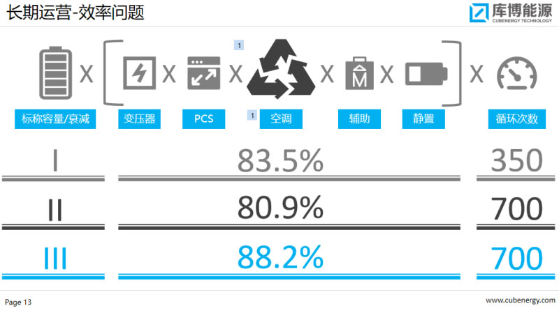 根據(jù)我們看到的不同項(xiàng)目,總結(jié)了3種不同的情況:一是因?yàn)榭照{(diào)溫度下降不下來(lái),需要降功率運(yùn)行,降功率運(yùn)行最開(kāi)始的時(shí)候系統(tǒng)設(shè)計(jì)700次,現(xiàn)在只能是350次,溫度比較高,系統(tǒng)的效率達(dá)不到要求。二是溫度上不來(lái)需要加空調(diào),加了空調(diào)負(fù)載以后,還是700次,效率只有80.9%。三是每天兩充兩放,循環(huán)700次,效率達(dá)到88.2%。盡量保持良好的運(yùn)行狀態(tài)。