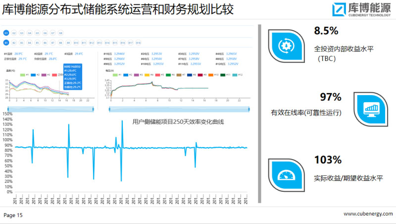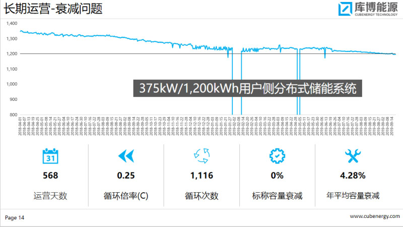 而在整體運(yùn)營(yíng)效率可控的前提下,如果運(yùn)營(yíng)的好,子系統(tǒng)選型都能中規(guī)中矩沒(méi)有明顯短板,那么這個(gè)系統(tǒng)的運(yùn)營(yíng)將會(huì)是有保障的。這是我們用戶側(cè)一個(gè)真實(shí)的項(xiàng)目,375KW/1200kWh用戶側(cè)分布式儲(chǔ)能系統(tǒng),正式運(yùn)營(yíng)時(shí)間從2018年4月1日開(kāi)始,直到做這個(gè)演講的材料時(shí)候9月中旬,中間有春節(jié)和5.1勞動(dòng)節(jié)的因?yàn)槿珡S停工對(duì)應(yīng)的系統(tǒng)短暫停機(jī)。標(biāo)稱容量1200度電的系統(tǒng),運(yùn)營(yíng)天數(shù)568天,循環(huán)倍率0.25C,循環(huán)次數(shù)1116次,標(biāo)稱容量衰減0%,在經(jīng)過(guò)18個(gè)月的運(yùn)行之后,標(biāo)稱容量仍然大于1200度電。當(dāng)然這里面有很多原因,具體情況,如果有機(jī)會(huì)我們單獨(dú)再做專門(mén)匯報(bào)。